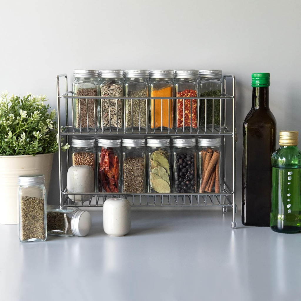 Raft condimente Navaris, 2 niveluri 30x26x14.5 cm, pliabil, crom, negru, metal