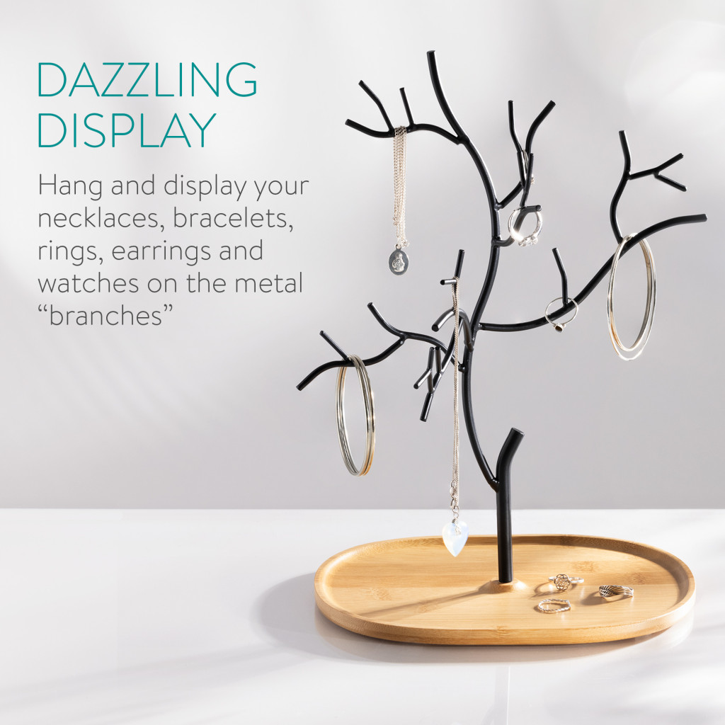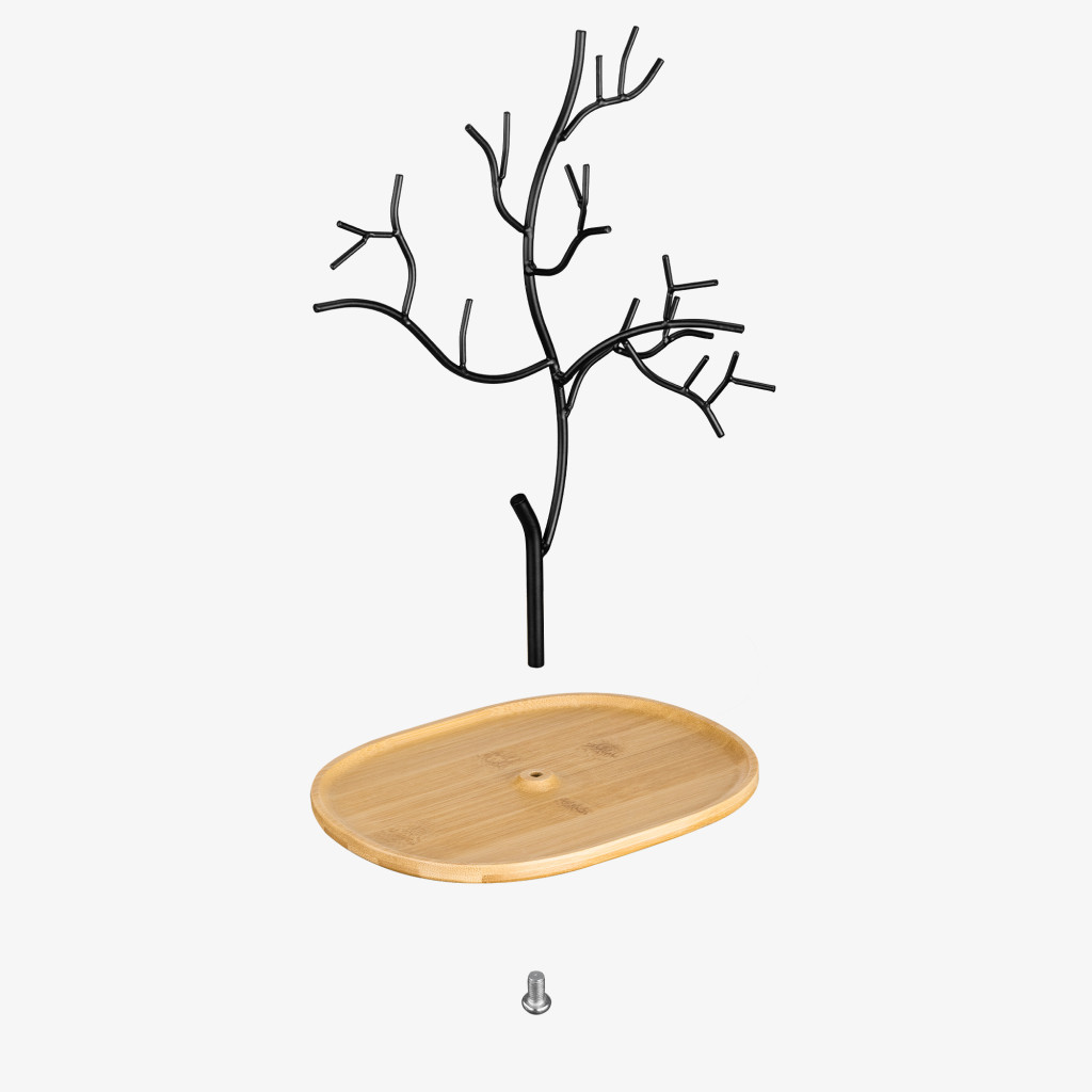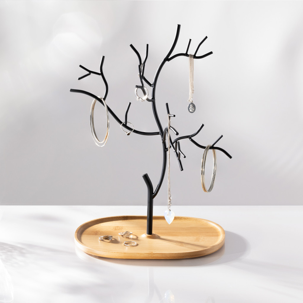 Suport bijuterii Navaris, arbore cu baza din bambus, 22x15.5x31 cm, organizare coliere, negru, bambus