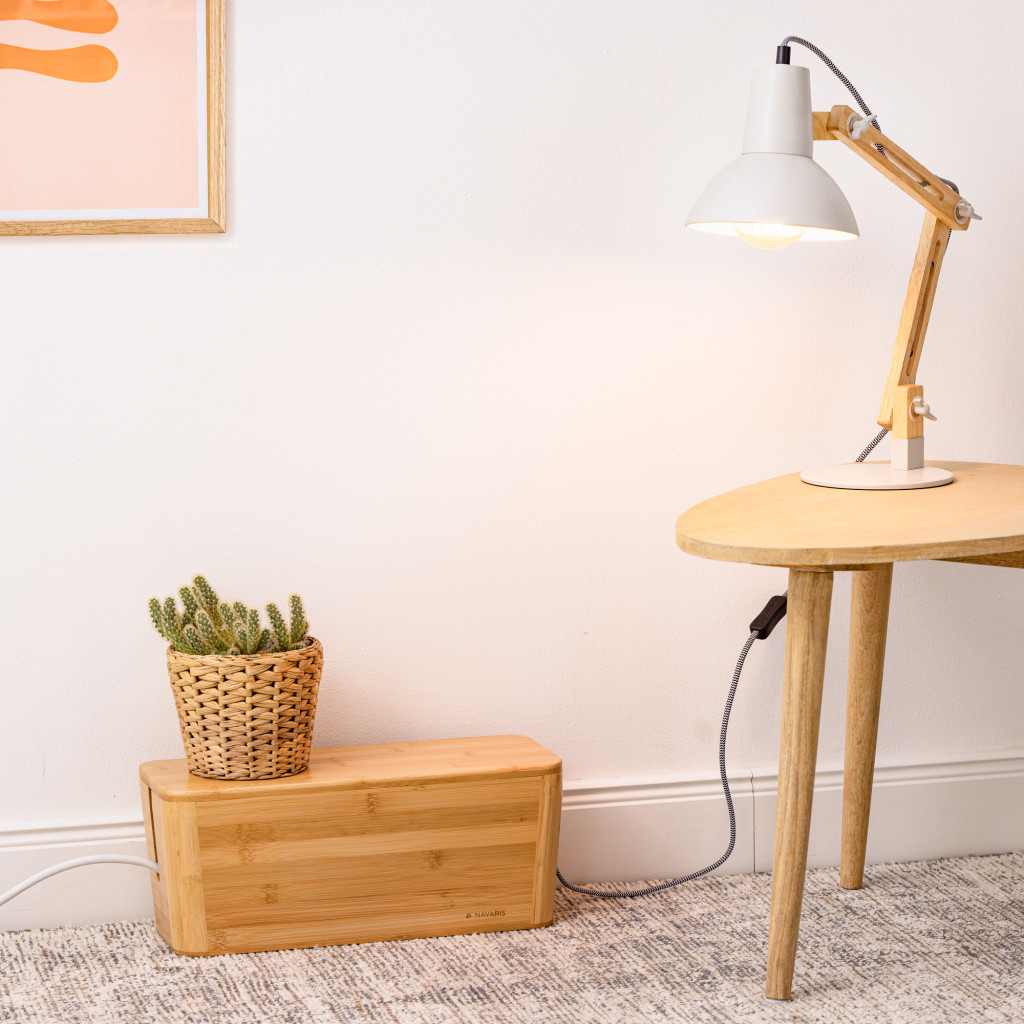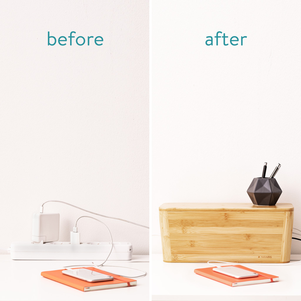 Cutie organizator cabluri XL Navaris, 39.4x16x16 cm, capac magnetic, management cabluri, maro, bambus